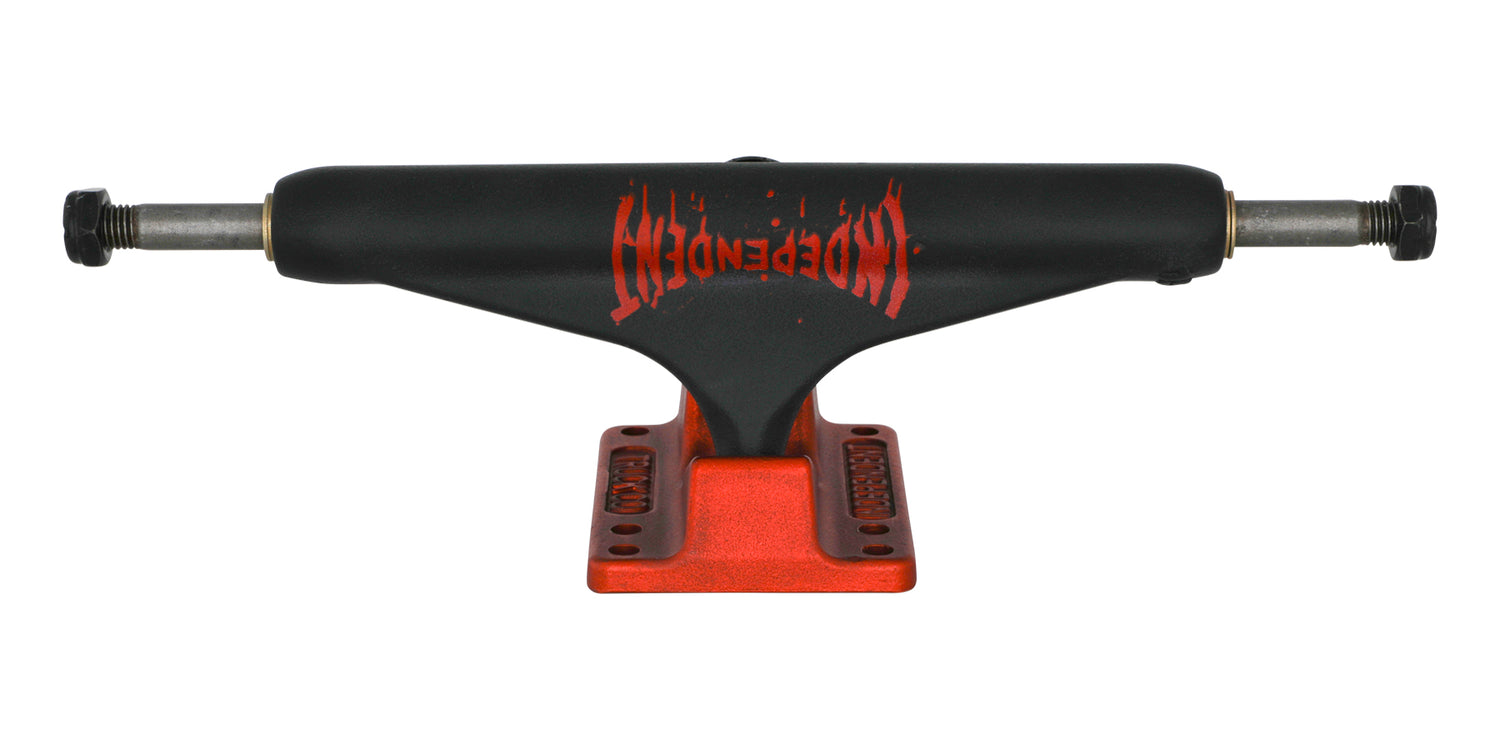 <p>Independent Stage 11 Trucks: A durable, all purpose truck for any type of skateboarding.</p><p>The Independent Stage 11 Splatter Span Black Ano Red trucks features flat black hanger with Independent Splatter Span logo on front, red bushings and red anodized baseplate. Independent Splatter Span Apparel and Griptape Availble Holiday 2025.</p><p><br />Specifications:</p>Lightweight & Strong Aluminum Construction: Made from A356 T6 heat-treated aluminum for long-lasting durability, superior grind feel, and reduced weight.Steel Axle Built & Tested To Handle Heavy Landings: Premium Chromoly Steel Axle designed to handle heavy impacts and extended wear for ultimate reliability.Unbreakable Kingpin: Grade 8 carbon alloy steel engineered to withstand the toughest sessions - no bending, no breaking.Responsive 90a Cushions: Provides precise turning and smooth, controlled carves.55mm Tall - Independent's Tried & True Classic Height: Delivers optimal control and smooth rides while ensuring proper wheel clearance for wheels 56mm and under.6-hole baseplate (159 size only): Universal Compatibility seamless fit with both old and new school mounting patterns.<p><br />Independent Trucks are Built to Grind and Guaranteed for Life.<br /><br />About Independent Truck Company</p><p>Independent Trucks is the #1 choice of professional skateboarders since 1978 and "Built to Grind"! Skateboarding's most iconic brand and leading manufacturer of skateboard trucks, hardware, clothing, and accessories.</p>