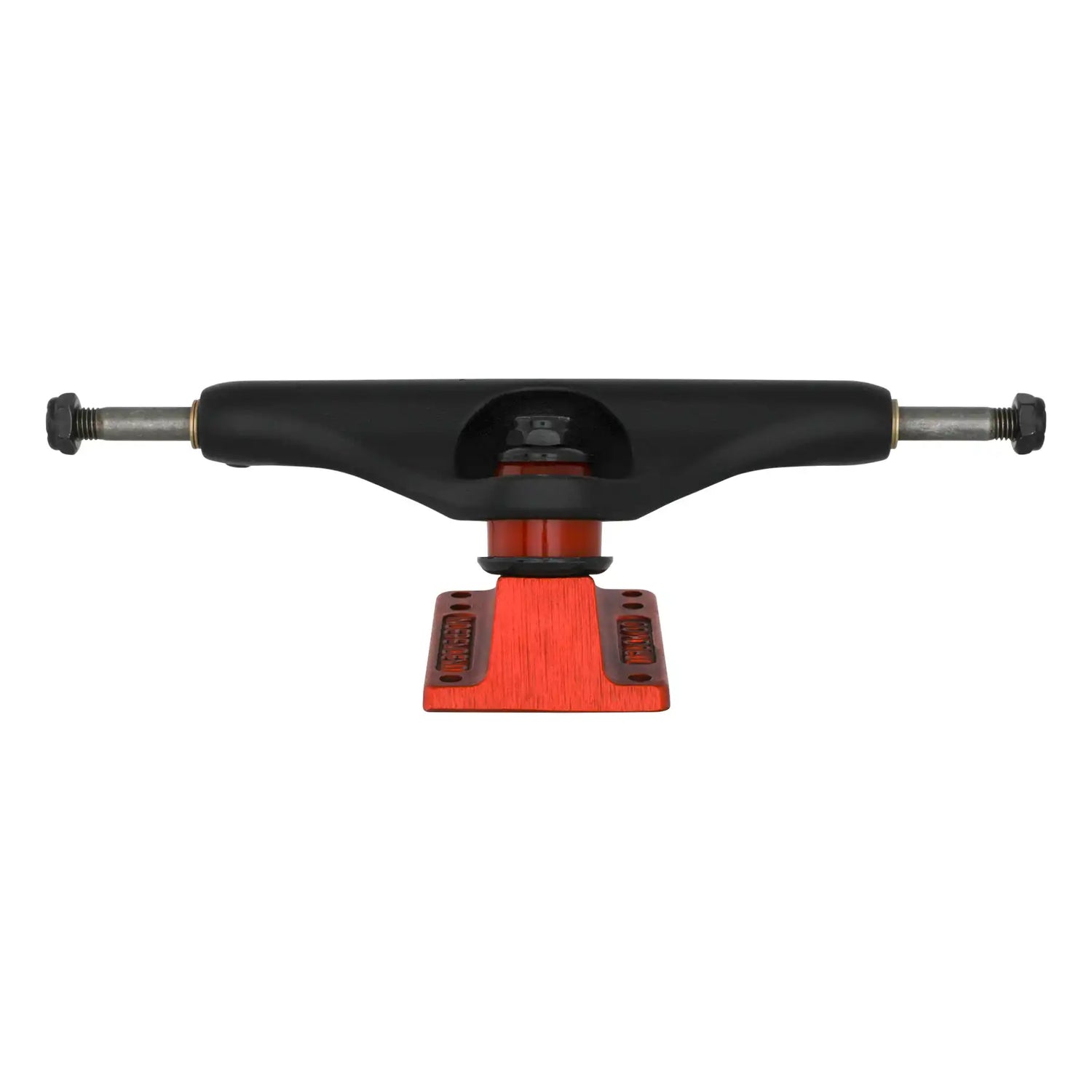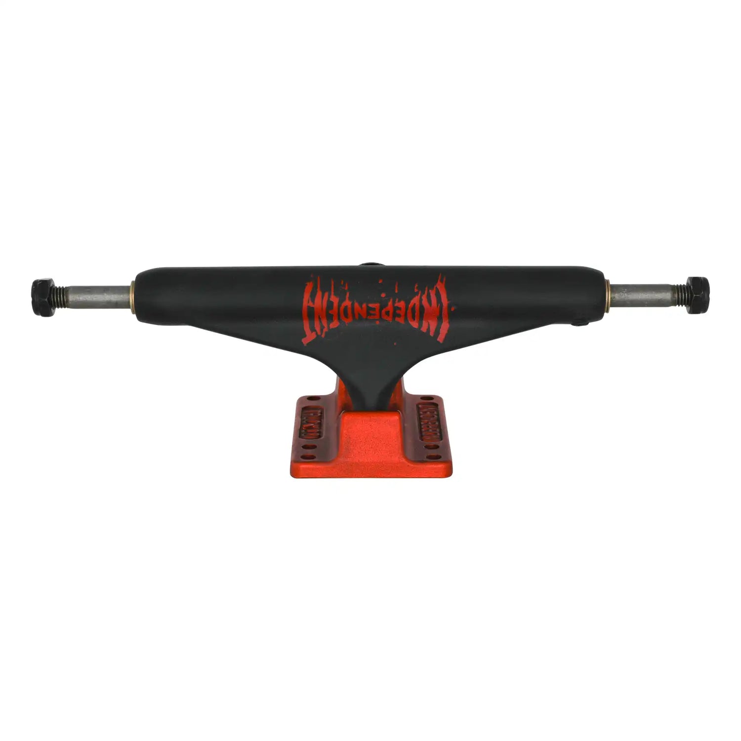 The Independent Stage 11 Splatter Span Black Ano Red trucks features flat black hanger with Independent Splatter Span logo on front, red bushings and red anodized baseplate. Independent Splatter Span Apparel and Griptape Availble Holiday 2025.